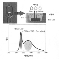 차세대 광디바이스의 파장변환재료로서 고출력에서도 신뢰성과 재현성이 높은 백색 LED는 <그림 8>과 같이 청색 LED와 황색을 나타내는 Ce+3 : YAG 형광체 결정을 조합해서 만들어진다. 이처럼 최근 백색 LED 램프는 고출력화가 가능하여 강한 광속을 필요로 하는 가정조명 및 자동차 헤드라이트, 대형디스플레이기기 등에 활용되기 시작하였다. 고 출력화를 실현하기 위하여 YAG조성의 결정화 유리를 사용하는데, 이는 저융점 유리가 결정화 시에 형광체를 지닌 결정이 석출되어 결정화 유리 내에 분산됨으로써 다중산란으로 여기광 흡수를 촉진시켜 발광 강도를 높인 것이다.