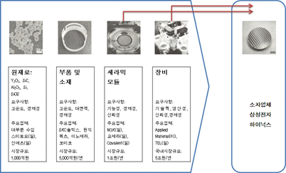 대표적인 예로 Si3N4에 첨가되는 희토류인 La2O3, Nd2O5, Gd2O3, Yb2O3 경우 각각 α-β 상전이를 촉진시켜서 미세구조를 침상으로 만들어 파괴인성을 증가시키거나<그림 12>, La > Sm > Er > Yb > Lu등의 이온반경 크기 순서로 입계에 나노미터 단위의 유리상(glass)을 형성하여 열팽창계수 차이로 인한 파괴인성을 증가시킨다. <그림 13>에 반도체 세라믹스 공정에 사용되는 엔지니어링 세라믹스의 Supply Chain을 나타내었다.