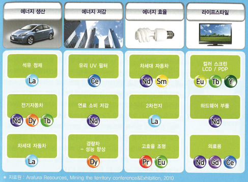 <표 1>에 희토류의 산업적 활용분야에 대하여 제시하였는데, 희토류에서 가장 사용빈도가 높은 원소는 란탄(La)과 네오듐(Nd), 세륨(Ce), 유로퓸(Eu) 순이다.