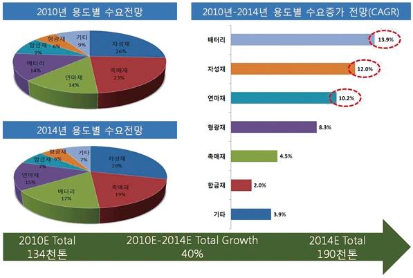 또한 <그림 3>에 나타낸 희토류 용도별 산업수요와 같이 향후 사용량이 급속히 증가될 것으로 예상되는 리튬(Li) 이차전지의 전극소재로 란탄산화물이 일부 활용되고 있다.
