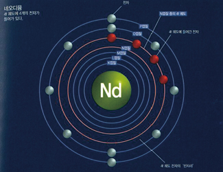 <그림 5>는 네오듐의 원자구조로 4f 궤도에서의 전자배치를 제시하였다. 두 번째로는 <그림 6>과 같이 희토류의 이온반경 차이에 기인한 것으로 희토류와 전이금속이 복합산화물을 이루는 ABO3 페롭스카이트 구조에서는 A 또는 B 사이트에 희토류가 들어가며, 희토류의 이온반경에 따라 다양한 유전체 특성을 발현한다. 한편, Y2O3를 ZrO2에 첨가 시 이온전하 차이로 인한 격자결함을 생성하여 산소센서로 응용된다. 이상과 같은 희토류의 기능성 부여 요인들로 인해서 세라믹소재는 1899년의 Y2O3 첨가 안정화 지르코니아로 부터 1995년도에 개발된 이온전도체에 이르기 많은 발전을 이루어 왔다.