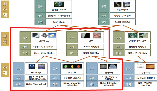형광체에 사용된 희토류 원소의 양은 전희토류 소비량의 약 7%에 불과하지만 금액으로 보면 전체 희토류의 약 50%를 점유하고 있어서 희토류 산업에 있어서 형광체의 비중이 매우 높다는 것을 알 수 있으며, <그림 7>에 디스플레이 산업에 있어서 형광체를 기초로 한 Supply Chain을 나타내었다.
