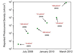그림2: 그래프는 밴더빌트 연구원들이 바이오 태양전지로부터 생산한 전류의 급격한 증가를 보여준다.