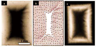 <그림> 높은 임계전류밀도를 갖는 도핑된 페로닉타이드 초전도체. (a)제로필드쿨링 후 10K, 167mT에서 직사각형의 슬래브를 보이는 (Ba0.6K0.4)Fe2As2 벌크의 자기광학 이미지, (b)제로필드쿨링시 계산한 전류흐름라인이 벌크를 따라 순환하고 있다, (c)제로필드쿨링 후 5.7K, 166mT에서 갇힌 자기흐름이 자기광학이미지에 나타났다가 곧 가해진 필드에 의해 사라진다.