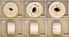 그림. 기계적 강도와 생체적합성이 있는 에퍼타이트와 ZrO2 혼합물 지지대는 마이크로웨이브 오븐에서 1300℃(a, b), 1400℃(c, d), 1500℃(e, f) 온도대에서 소결되었다.