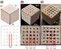 그림. (a)컴퓨터 모델, (b)3D-프린트란 녹색 구조의 사진, (c)750℃까지 분당 2℃로 열처리한 소결한 글라스/HAp 복합물의 구조. 숫자는 각 면의 mm사이즈의 크기.