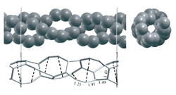 그림. (상) 3.2A 두께를 가진 CNT10R 나노튜브의 정면도 및 측면도, (하) 파괴된 결합의 구조도(점선으로 나타냄).