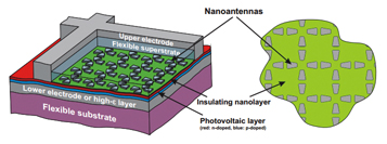 핀란드 알토대학(Aalto University)의 Constantin Simovski와 동료들은 이러한 아이디어를 구현할 수 있는 새로운 빛-포획(Light-trapping) 구조를 설계하고 있다. 이들의 아이디어는 규칙적인 배열을 가진 은 나노안테나(Silver Nanoantennas)를 셀 위에 덮는 것이다(그림 참조). 이 나노안테나는 외부에서 들어오는 일반적인 파장을 특정 파장으로 변환하여 태양전지 슬랩(Slap) 전체에 전파시키는 역할을 한다.