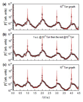 그림 3. (a) 10-6 Torr, (b) 10-2 Torr 후에 10-6 Torr, (c) O2 분위기 하의 10-2 Torr에서 성장된 샘플의 산란 강도.