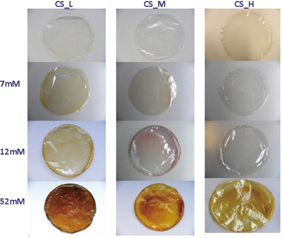 그림 2. 키토산의 분자량과 은 선구물질의 탑재에 따라서 달라지는 키토산과 은-키토산 박막의 형상.