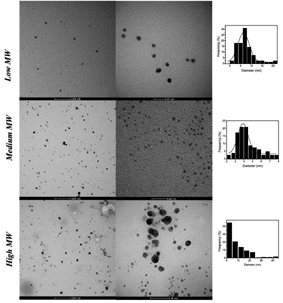 모든 키토산 용액들은 다음과 같은 과정으로 제조되었다: 99.8wt% 아세트산은 0.5M 액체 용액을 달성하기 위해서 희석되었다; 키토산 박편은 용액이 될 때까지 12시간 동안 65℃로 용해되었다. 150ml의 키토산 용액은 스터링 하에서 95℃로 가열되었고 60ml의 질산은 용액(7, 12, 26, 52mM) 가열 중에 추가되었다. 확산은 12시간 동안 스터링 하에서 유지되었다. 감광이 분명히 관찰되었고, 이것은 은 나노입자의 형성을 나타낸다. 키토산의 분자량이 점점 더 낮을수록, 콜로이드 은-키토산 나노복합물의 색상은 점점 더 어두워진다.