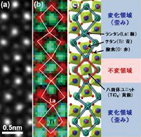 그림 2. 구조변화 후의 세라믹의 특이한 원자 배열. (a) 전자현미경 사진, (b) 원소식별법에 의한 원자분포도(적: 란탄원자, 녹: 티탄원자), (c) 결정고조의 모식도