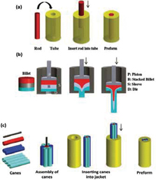 그림. 복합물 섬유 제조를 위한 일반적인 3가지 공정 (a) rod-in-tube, (b) 추출, (c ) stack-and-draw