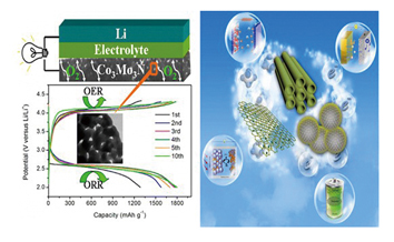 기존의 리튬 공기 배터리의 순환 수명이 짧은 문제점을 해결하기 위해 연구팀은 Co 원소를 질화물 재료에 도입하여 두 가지 효과의 촉매 성능을 보유한 Co3Mo3N 3원 재료를 디자인하고 합성하였으며 동 재료에 기반한 메조 기공(Mesoporous) 나노 음극을 개발하여 리튬 공기 배터리가 심층 정도의 방전을 실행할 때의 순환 수명을 대폭 향상시켰다(J. Phys. Chem. C, 2013, 117, 858-865).