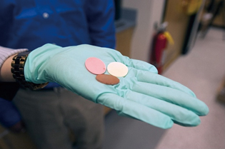 그림. MIT 박사후 과정인 Gisele Azimi(왼쪽)은 희귀 지구 금속 산화물로 만들어진 13개의 다른 세라믹 디스크를 Kripa Varanasi 조교수와 함께 전시하고 있다. 이들 뒤에는 분말 산화물을 고체 세라믹 형태로 만드는데 사용한 노가 있다.