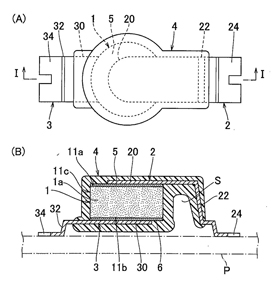 세라믹 콘덴서는 세라믹 소자(1)와, 세라믹 소자(1)의 표리에 접합된 금속단자(2,3)와, 세라믹 소자(1) 및 금속단자(2,3)의 일부를 피복하고 있는 절연성 외장재(4)를 포함하고 있다. 금속단자(2)는 전극(5)에 접합된 접합부(20)와, 접합부(20)에 대하여 평행하게 연장되고 실장 기판(P)에 실장되는 실장부(24)와, 접합부(20)와 실장부(24)를 연결하는 중계부(22)를 가지고 있다. 그리고, 세라믹 소자(1)의 외주면(11c)과 금속단자(2)의 중계부(22)가 대향하는 부분에 있어서, 세라믹 소자(1)의 외주면(11c)을 피복하는 절연성 외장재(4)와, 금속단자(2)의 중계부(22)를 피복하는 절연성 외장재(4) 사이에 공간(S)이 형성되어 있다.