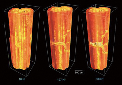 그림. CT 스캔이 1,750°C에서 인장하중을 받는 세라믹 혼합물에 미세크랙이 형성되는 것을 보여주고 있다. 이 자료는 버클리 연구소 Advanced Light Source에서 독자적인 기계적 시험 장비를 통해 얻은 것이다.