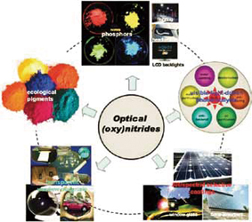 흥미로운 응용은 자연친화적인 안료이다. 각양각색의 (Ca,La)Ta(O,N)3과 같은 전이금속 산화질화물 화합물은 중금속기반의 안료를 대체할 수 있다. 이온공유결합 (산화)질화물 그룹의 응용은 방호구(ACerS Bulletin지의 2013년 3월호에 게재된 AlON에 대한 논문 참고), 투명 창문, 판, 돔 등, 일반적인 조명을 반도체 LED등, 자가용 전조등, LCD 백라이트, 그리고 FED와 같은 반도체 기기들을 포함한다. 이러한 산화질화물들 또한 희귀금속과 화합되었을 때 자연친화적 안료로써의 응용이 가능해질 것으로 보인다. 이렇듯 (산화)질화물 재료의 광학적 성질의 응용에 대한 주제는 무한하다.