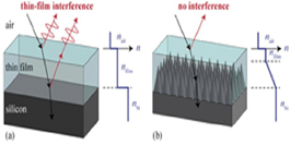 나방의 눈 구조에서 영감을 얻은 노스캐롤라이나 주립대학의 연구원들은 두 개의 박막 필름이 만나는 계면에서의 반사를 제한함으로써 자연에서 일반적으로 관찰되는 “박막 필름 간섭” 현상을 억제하는 나노 구조를 개발하였다. 이 재료는 박막 태양전지 및 다른 광학전자 장비의 효율을 향상시킬 수 있는 잠재성을 가진다. 박막 간섭은 한 물질의 박막이 두 번째 물질의 맨 위에 놓일 때 발생한다. 예를 들면, 박막 간섭은 물 웅덩이에 가솔린이 있을 때 우리가 보게 되는 무지개 광택이다.