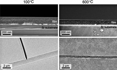 광화학증착법에 의해 만들고 나서 공기중에서 100 °C (좌) 와 600°C (우)에서 1 시간 열처리된 Fe₂O₃ 박막에 대한 단면, 그리고 위에서 본 주사현미경사진.