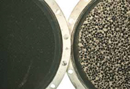 그림 1. 좌측 “벌집” 디젤 배기 필터와 우측 Empa의 세라믹 폼 재료 필터 비교.