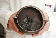 그림 2. 이 손상된 벌집 필터가 Empa의 연구자들에게 Foamcat을 개발할 아이이디어를 제공하였다. 작은 영역의 모노리스가 녹았으나 이웃하는 부분들은 거의 사용되지 않은 채이다. 이는 배기 가스의 흐름이 고르지 않다는 것을 보여준다.