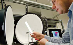 그림. Philips 연구의 Rifat Hikmet이 현 LED등에 비해 에너지 사용량을 반으로 줄이는 TLED의 첫 프로토 타입에 대해 working on작업/연구/일하고 있다.
