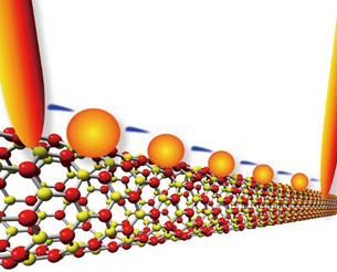 그림 1. 붕소 질화물 나노튜브 위의 금 양자점의 전자 플래시(Electrons flash). 이번 연구진이 만든 양자-터널링 장치는 반도체 재료를 사용하는 일 없이 상온에서 트랜지스터처럼 활용된다.