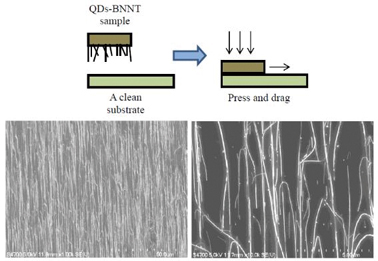 그림 2. (상부) 산화된 Si 기판 위에 양자점-붕소 질화물 나노튜브의 정전 전사 절차. (하부) 잘 정렬된 나노튜브(왼쪽)와 분산된 나노튜브(오른쪽)의 주사 전자 현미경 이미지.