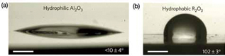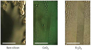 그림 2. 실리콘 위의 막상 증기응축 대 두 REO 소수성 표면의 비교.