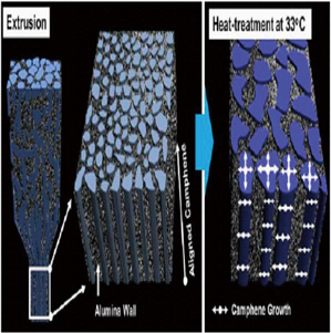 본 발명은 생체세라믹 분말과 캠핀(camphene)을 캠핀의 융점(예, 60℃) 이상의 온도로 가열하여 액상 상태의 균질한 세라믹/동결매체 슬러리를 제조하고, 이를 상온에서 고체화(solidi-fication)시킨 후, 세라믹/캠핀 복합체를 상온에서 압출하여 고체화된 캠핀이 압출 방향으로 고도로 정렬되도록 유도한 후, 이를 세라믹/캠핀 슬러리의 고화온도(solidification point) 근처에서 일정 시간 동안 다시 1차 열처리하여, 캠핀이 압출 방향에 따라 정렬된 방향에 수직한 방향으로만 성장하도록 유도하고, 이를 동결건조하여 제거하고 고온에서 세라믹을 2차 열처리(소결)하여, 골조직 재생에 필요한 임계 크기(예, 100 마이크론) 이상의 정렬된 기공구조를 갖는 고기능성 생체세라믹 다공체의 제조방법 및 이에 의해 제조된 다공체에 관한 것이다.