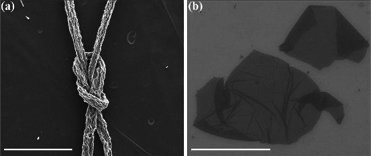 그림 2. (a) 그래핀 산화물 박편으로 만든 섬유의 매듭; 스케일 바는 500μm이다. (b) 실리콘 기판 위의 단일층 그래핀 산화물 박편; 스케일 바는 50 μm이다.
