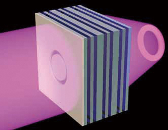 은(녹색)과 티타뉴산화물(파란색)의 나노레이어가 층층이 번갈은 자외선 메타물질 평면렌즈의 도식. 자외선광이 비춰지면 판에 있는 샘플 물체의 3D 이미지가 판의 반대편 빈공간에 투사된다.