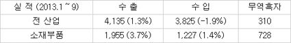 지난달 15일 산업통상자원부는 1~9월 소재부품 수출과 수입은 전년 동기 대비 3.7%, 1.4% 늘어난 1955억달러와 1277억달러를 기록했다고 밝혔다. 무역흑자는 728억달러로 7.8% 증가했다. 9월 수출 실적은 추석 연휴에 따른 조업일수 감소로 인해 전년 대비 소폭 감소했지만 일평균 수출은 10억8000만달러로 사상 최고치를 기록했다.