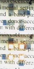 ◁제작된 투명 OLED의 발광 전 후 사진. 투명 OLED의 발광 전 후 사진으로 뒷배경의 글자들이 헤이즈 없이 선명하게 보인다.