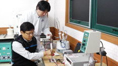 △김성협 필스톤 대표(왼쪽)와 연구진이 알루미늄을 이용한 금속절연기판의 성능을 테스팅 하고 있다.