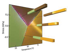 Cobden은 “중요한 것은 세 가지 상의 결정구조가 나노와이어를 따라 세 가지 격자상수를 지니고 있다는 점,”이라 말했다. 단위격자는 조금 더 길어지며, 열역학적으로 클라우지우스-클라페이론 식(Clausius-Clapeyron equation) 때문에 가장 긴 상이 선호된다. 온도와 길이(응력)의 함수로 나타나는 상들에 대한 체계적인 연구로, 해당 팀은 VO2의 삼중점이 0 응력과 65°C±0.1°C에 해당된다는 것을 밝혀냈다.