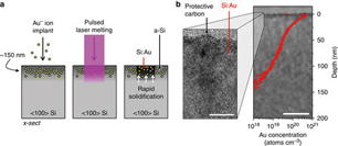 이 방법은 수백 나노미터의 실리콘 속에 금을 주입하고 몇 나노세컨드(nanosecond) 동안에 레이저를 사용해서 표면을 용융한다. 실리콘 원자들은 거의 완벽한 격자 속에 재결정화할 수 있고, 금 원자들은 격자 속에 포집되기 전에 탈출할 수 있는 시간이 없다.