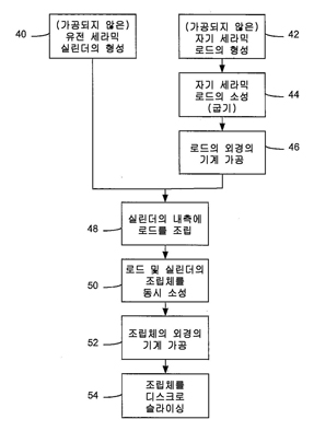 본 발명에 따라 복합 자성-유전 디스크 조립체를 제조하기 위한 방법은, 유전 세라믹 실린더를 형성하는 것, 자성 세라믹 로드를 형성하는 것, 로드-실린더 조립체를 형성하기 위해 유전 세라믹 실린더 내측에 동축으로 자성 세라믹 로드를 조립하는 것, 로드-실린더 조립체를 굽는 것 소성하는 것), 그리고 복수 개의 디스크 형상의 복합 자성-유전 조립체를 형성하기 위해 로드-실린더 조립체를 슬라이싱하는 것을 포함한다. 상기 자성-유전 디스크 조립체는, 예컨대 서큘레이터, 아이솔레이터, 또는 유사한 전자 구성요소를 제조하는 데 이용될 수 있다. 이에 따라, 상기 디스크 조립체를 제조하기 위한 방법은 상기 전자 구성요소를 제조하기 위한 방법의 일부로서 포함될 수 있다.