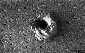그림. 알루미나의 절연파괴로 인한 대표적인 ‘관통’. 결정립 뽑힘(pull-out)에 의해