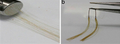 (b) 각각의 필라멘트 속에서 쉽게 분리되는 건조된 실.