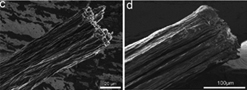 그림 2. (c) 불균일한 모양을 가진 그래핀 산화물 섬유. (d) 많은 그래핀 산화물 섬유로 구성된 실.
