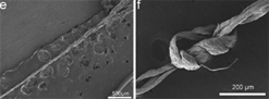(f) 매듭이 있는 실. 이것은 제조된 구조가 매우 유연하다는 것을 보여준다.