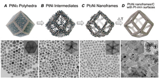 “우리는 이번에 백금과 니켈의 바이메탈 나노결정으로 이루어진 내구성이 우수하고 고활성의 새로운 전극촉매를 개발했다”고 버클리연구소 재료과학부의 화학교수이자 이번 연구 프로젝트의 책임자인 Peidong Yang 교수는 설명했다. “이번 촉매는 표면에 백금이 풍부하게 분포된 3차원 공동 나노프레임 구조를 이루고 있다. 산소와 수소의 산화 환원 반응에서 요구되는 많은 양의 백금의 양을 줄일 수 있어서 차세대 촉매 설계에 있어서 비용 절감을 가져다 주는 동시에 활성도는 증가시킬 수 있다는 장점을 가지고 있다”고 밝혔다.