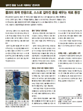 이러한 신기술 연구성과는 2014년 1월 일본 시멘트 신문사(그림1)의 기획・인사・기술・보수와 관련된 지면(4면)에 “자기치유 콘크리트 해외전개-서울과 동경에 회사설립-“이라는 제목으로 소개되었으며, 또한 4월에 재료과학 분야 전문 소개지인 뉴턴의”-세상을 바꾼다- 신소재, 신재료 100”(그림2)에 선정되어 일본, 한국 동시에 자기치유 소재와 관련되어 소개 되었다.