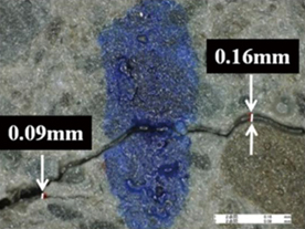 또한 초기 비교적 충분한 수분 공급에 의해 미수화된 시멘트 입자가 적게 존재하는 일반 물/시멘트 비(W/C=0.45%)에서도 균열 부위에 충분히 시멘트계 결정질을 생성함으로써 자발적으로 균열을 치유 할 수 있는 새로운 자기치유 콘크리트를 개발하였다.