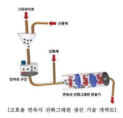 또 지금까지의 산화그래핀 합성 방법은 회분식 반응기에 많은 양의 산과 강력한 산화제를 그라파이트와 혼합해 산화그래핀을 생성했다. 이 방식은 반응 시간이 매우 길어 산화그래핀 생산 규모에 많은 제약이 있을 뿐 아니라 합성 후 폐산액과 폐산화제가 부산물로 생성돼 처리 비용이 만만치 않다. 산화그래핀 1톤을 생산하기 위해 91톤의 독성 부산물을 발생시킨다.
