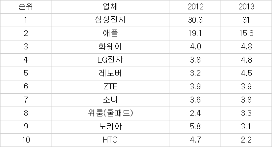 세계 스마트폰 시장점유율<자료: 가트너>