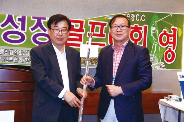 세라믹 신성장 골프대회 첫 이글을 기록한 파인세라믹스협회 전선규 회장(오른쪽)과 이글증서를 수여한 월간세라믹스·대호단양CC 대표 황호연 회장(왼쪽)