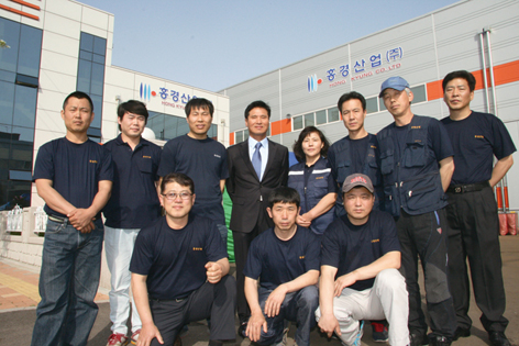 새로 지어진 공장과 사옥 앞에 모인 홍경산업의 김홍식 대표(왼쪽에서 네 번째)와 직원들